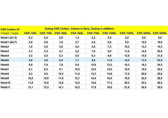 DSR Carbon v / s: Средство для удаления нитратов можно дозировать в соответствии с таблицей.